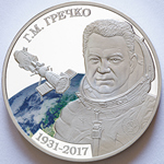в центре – крупным планом портрет космонавта Г.М. Гречко в открытом шлеме скафандра на фоне космического корабля и цветного изображения планеты Земля; вверху слева – надпись «Г.М. ГРЕЧКО», внизу – годы жизни «1931-2017».