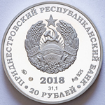 в центре – изображение Государственного герба Приднестровской Молдавской Республики; по кругу – надписи: вверху – «ПРИДНЕСТРОВСКИЙ РЕСПУБЛИКАНСКИЙ БАНК», внизу – «20 РУБЛЕЙ»; в нижней части под гербом – год выпуска монеты «2018», ниже – содержание химически чистого металла в граммах, слева – логотип изготовителя, государственное пробирное клеймо, справа – обозначение металла, проба сплава.