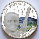 в центре – портрет Королёва С.П., справа – изображение космической ракеты, на фоне звёзд со вставками двух полудрагоценных камней, вверху – надпись «С.П. КОРОЛЁВ», внизу – годы жизни «1907-1966».