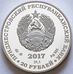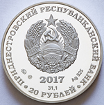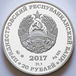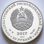 изображение Государственного герба Приднестровской Молдавской Республики; по кругу – надписи: вверху – «ПРИДНЕСТРОВСКИЙ РЕСПУБЛИКАНСКИЙ БАНК», внизу – «20 РУБЛЕЙ»; в нижней части под гербом – год выпуска монеты «2017», ниже – содержание химически чистого металла в граммах, слева – логотип изготовителя, государственное пробирное клеймо, справа – обозначение металла, проба сплава.