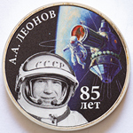 в центре – крупным планом портрет космонавта Леонова А.А. в шлеме на фоне цветного изображения планеты Земля и космического корабля с космонавтом в открытом космосе; вверху слева – надпись «А.А. ЛЕОНОВ», внизу справа – надпись «85 ЛЕТ».