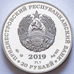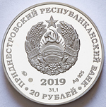 в центре – изображение Государственного герба Приднестровской Молдавской Республики; по кругу – надписи: вверху – «ПРИДНЕСТРОВСКИЙ РЕСПУБЛИКАНСКИЙ БАНК», внизу – «20 РУБЛЕЙ»; в нижней части под гербом – год выпуска монеты «2019», ниже – содержание химически чистого металла в граммах, слева – логотип изготовителя, государственное пробирное клеймо, справа – обозначение металла, проба сплава.