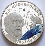 в центре – портрет К.Э. Циолковского, справа – изображение космических аппаратов и планеты Земля, выполненной в цвете, на фоне звёзд со вставками двух полудрагоценных камней, вверху – надпись «К.Э. ЦИОЛКОВСКИЙ», внизу – годы жизни «1857-1935».