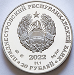 в центре – изображение Государственного герба Приднестровской Молдавской Республики; по кругу – надписи: вверху – «ПРИДНЕСТРОВСКИЙ РЕСПУБЛИКАНСКИЙ БАНК», внизу – «20 РУБЛЕЙ»; в нижней части под гербом – год выпуска монеты «2022», ниже – содержание химически чистого металла в граммах, слева – логотип изготовителя, государственное пробирное клеймо, справа – обозначение металла, проба сплава.