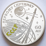 в центре – изображение искусственного спутника, летящего вокруг планеты Земля,выполненной в цвете, вверху – надпись «ПЕРВОМУ СПУТНИКУ», внизу – надпись «60 ЛЕТ», справа – изображение ракеты-носителя на фоне звёзд со вставкой полудрагоценного камня.