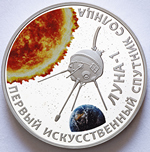 в центре – крупным планом изображение искусственного спутника на фоне космического пространства и цветного изображения планеты Земля и Солнца; внизу по кругу слева направо – надписи «ЛУНА-1» и «ПЕРВЫЙ ИСКУССТВЕННЫЙ СПУТНИК СОЛНЦА».