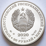 в центре – изображение Государственного герба Приднестровской Молдавской Республики; по кругу – надписи: вверху – «ПРИДНЕСТРОВСКИЙ РЕСПУБЛИКАНСКИЙ БАНК», внизу – «20 РУБЛЕЙ»; в нижней части под гербом – год выпуска монеты «2020», ниже – содержание химически чистого металла в граммах, слева – логотип изготовителя, государственное пробирное клеймо, справа – обозначение металла, проба сплава.