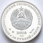 в центре – изображение Государственного герба Приднестровской Молдавской Республики; по кругу – надписи: вверху ­­­­­– «ПРИДНЕСТРОВСКИЙ РЕСПУБЛИКАНСКИЙ БАНК», внизу – «10 РУБЛЕЙ»; в нижней части под гербом  – год выпуска монеты «2018», ниже – содержание химически чистого металла в граммах, слева – логотип изготовителя, государственное пробирное клеймо, справа – обозначение металла, проба сплава.