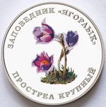 в центре – стилизованное цветное изображение прострела – представителя растительного мира заповедника «Ягорлык», вверху – по кругу надпись «ЗАПОВЕДНИК «ЯГОРЛЫК», внизу – по кругу надпись «ПРОСТРЕЛ КРУПНЫЙ».
