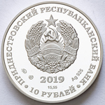 в центре – изображение Государственного герба Приднестровской Молдавской Республики; по кругу – надписи: вверху – «ПРИДНЕСТРОВСКИЙ РЕСПУБЛИКАНСКИЙ БАНК», внизу – «10 РУБЛЕЙ»; в нижней части под гербом – год выпуска монеты «2019», ниже – содержание химически чистого металла в граммах, слева – логотип изготовителя, государственное пробирное клеймо, справа – обозначение металла, проба сплава.