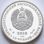 в центре – изображение Государственного герба Приднестровской Молдавской Республики; по кругу – надписи: вверху – «ПРИДНЕСТРОВСКИЙ РЕСПУБЛИКАНСКИЙ БАНК», внизу – «10 РУБЛЕЙ»; в нижней части под гербом – год выпуска монеты «2018», ниже – содержание химически чистого металла в граммах, слева – логотип изготовителя, государственное пробирное клеймо, справа – обозначение металла, проба сплава.