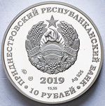 в центре – изображение Государственного герба Приднестровской Молдавской Республики; по кругу – надписи: вверху – «ПРИДНЕСТРОВСКИЙ РЕСПУБЛИКАНСКИЙ БАНК», внизу – «10 РУБЛЕЙ»; в нижней части под гербом – год выпуска монеты «2019», ниже – содержание химически чистого металла в граммах, слева – логотип изготовителя, государственное пробирное клеймо, справа – обозначение металла, проба сплава.
