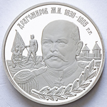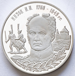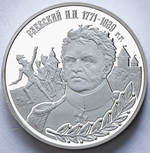 в центре – портрет генерала от кавалерии Раевского Н.Н. на фоне Бендерской крепости и фрагмента атаки, вверху – надпись «РАЕВСКИЙ Н.Н. 1771-1829 г.г.», внизу – изображение лавровой ветви.