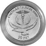 в центре – изображение сокола, летящего с распростёртыми крыльями, над ним – кадуцей – элемент эмблемы финансовой системы ПМР, сопровождаемый справа и слева шестью дугообразными полосами; вверху по кругу – надпись «СЧЁТНАЯ ПАЛАТА ПМР», внизу – надпись «20 ЛЕТ».