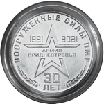 в центре – стилизованное изображение пятиконечной звезды, в середине которой в две строки надпись «АРМИЯ ПРИДНЕСТРОВЬЯ», на лучах звезды слева – надпись «1991», справа – надпись «2021»; вверху по кругу – надпись «ВООРУЖЕННЫЕ СИЛЫ ПМР», внизу в две строки – надпись «30 ЛЕТ» в обрамлении лавровых ветвей.