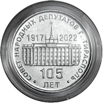 в центре – здание Тираспольского городского Совета народных депутатов, слева от него – надпись «1917», справа – надпись «2022», по кругу – надпись «СОВЕТ НАРОДНЫХ ДЕПУТАТОВ Г. ТИРАСПОЛЬ», внизу в две строки – надпись «105 ЛЕТ».