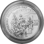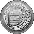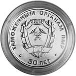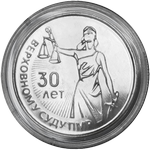 в центре – рельефное изображение раскрытой книги с текстом Конституции Приднестровской Молдавской Республики, Государственным гербом и флагом; по кругу – надписи: вверху слева – «30 ЛЕТ КОНСТИТУЦИИ», внизу – «ПРИДНЕСТРОВСКАЯ МОЛДАВСКАЯ РЕСПУБЛИКА».