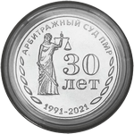 слева – изображение Фемиды – богини правосудия, справа – надпись «30 ЛЕТ», вверху по кругу – надпись «АРБИТРАЖНЫЙ СУД ПМР», внизу – надпись «1991-2021» в обрамлении лавровых ветвей.