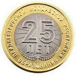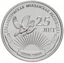 в центре диска на фоне солнца крупным планом – надпись «25 ЛЕТ», под ней – стилизованные колосья; по кругу – надпись «ОБРАЗОВАНИЯ ПРИДНЕСТРОВСКОЙ МОЛДАВСКОЙ РЕСПУБЛИКИ».