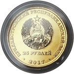 в центре – изображение Государственного герба Приднестровской Молдавской Республики; по кругу – надписи: вверху – «ПРИДНЕСТРОВСКИЙ РЕСПУБЛИКАНСКИЙ БАНК», внизу – год выпуска монеты «2017»; в нижней части под гербом – номинал «25 РУБЛЕЙ».