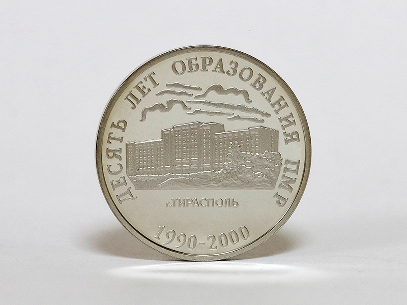 в центре – изображение Дома Правительства на фоне стилизованных парящих облаков, ниже – надпись «г.ТИРАСПОЛЬ»; по кругу – надписи: вверху – «ДЕСЯТЬ ЛЕТ ОБРАЗОВАНИЯ ПМР», внизу – «1990-2000».