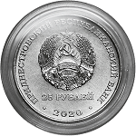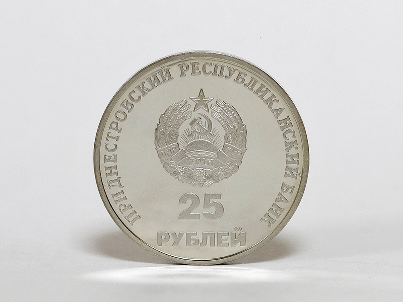 в центре – изображение Государственного герба Приднестровской Молдавской Республики; по кругу – надписи: вверху – «ПРИДНЕСТРОВСКИЙ РЕСПУБЛИКАНСКИЙ БАНК», внизу – год выпуска монеты «2020»; в нижней части под гербом – номинал «25 РУБЛЕЙ».