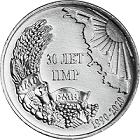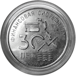 в центре – надпись в две строки «30 ЛЕТ», изображение символа рубля ПМР, справа – графическое изображение территории ПМР и символов восходящего развития, вверху – изображение платёжной карты и полукругом – надпись «ФИНАНСОВАЯ СИСТЕМА ПМР».