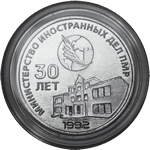 в центре – изображение здания Министерства иностранных дел ПМР, над ним – эмблема в виде пальмовой ветви на фоне земного шара, слева – надпись «30 ЛЕТ»; вверху по кругу – надпись «МИНИСТЕРСТВО ИНОСТРАННЫХ ДЕЛ ПМР», внизу – надпись «1992».
