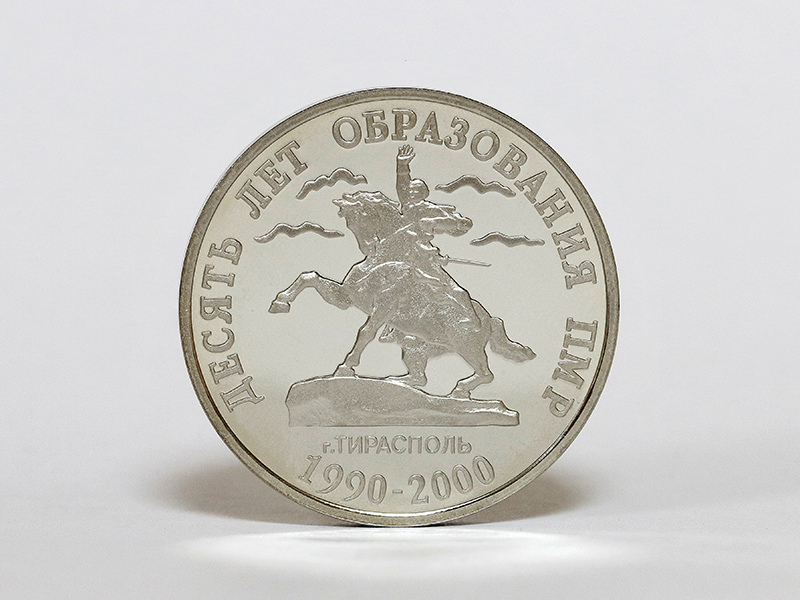 в центре – изображение А.В. Суворова верхом на коне на фоне стилизованных парящих облаков, ниже – надпись «г.ТИРАСПОЛЬ»; по кругу – надписи: вверху – «ДЕСЯТЬ ЛЕТ ОБРАЗОВАНИЯ ПМР», внизу – «1990-2000».