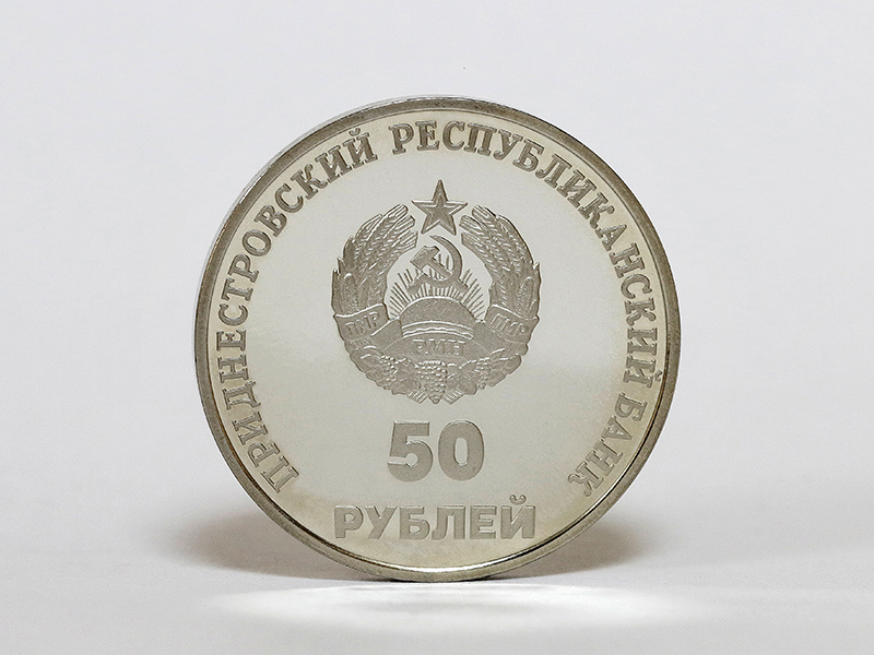 в центре – изображение Государственного герба Приднестровской Молдавской Республики; по кругу – надписи: вверху – «ПРИДНЕСТРОВСКИЙ РЕСПУБЛИКАНСКИЙ БАНК»; в нижней части под гербом – номинал «50 РУБЛЕЙ».
