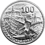в центре – элемент Памятника первой электростанции Молдавии, находящегося в г. Тирасполе, на фоне опор линий электропередач; вверху – надпись «100 ЛЕТ», внизу по кругу – надпись «ЭНЕРГЕТИЧЕСКОЙ ОТРАСЛИ».