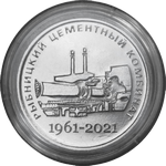 в центре – производственные сооружения цементного комбината, вверху полукругом – надпись «РЫБНИЦКИЙ ЦЕМЕНТНЫЙ КОМБИНАТ», внизу – надпись «1961-2021».