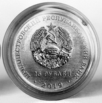 в центре – изображение Государственного герба Приднестровской Молдавской Республики; по кругу – надписи: вверху – «ПРИДНЕСТРОВСКИЙ РЕСПУБЛИКАНСКИЙ БАНК», внизу – год выпуска монеты «2019»; в нижней части под гербом – номинал «25 РУБЛЕЙ».