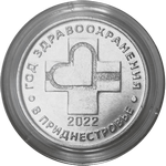 в центре – стилизованное изображение сердца на фоне символа медицины – креста, под ним – надпись «2022»; вверху по кругу – надпись «ГОД ЗДРАВООХРАНЕНИЯ», внизу – надпись «В ПРИДНЕСТРОВЬЕ».