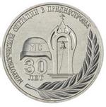 cправа – стилизованное изображение архитектурного сооружения – Арки Мира «Блаженны миротворцы», слева – каска военнослужащего миротворческих сил, под ней – надпись «30 ЛЕТ», вверху по кругу – надпись «МИРОТВОРЧЕСКОЙ ОПЕРАЦИИ В ПРИДНЕСТРОВЬЕ».