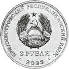 в центре – изображение Государственного герба Приднестровской Молдавской Республики; по кругу – надписи: вверху – «ПРИДНЕСТРОВСКИЙ РЕСПУБЛИКАНСКИЙ БАНК», внизу – год выпуска «2023»; в нижней части под гербом – номинал «3 РУБЛЯ».