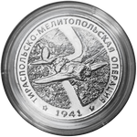 в центре – изображение летящего самолёта, под ним – графическое изображение полей и реки, вверху по кругу – надпись «ТИРАСПОЛЬСКО-МЕЛИТОПОЛЬСКАЯ ОПЕРАЦИЯ», внизу – надпись «1941» в обрамлении пятиконечных звёзд.