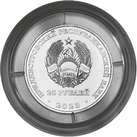 в центре – изображение Государственного герба Приднестровской Молдавской Республики; по кругу – надписи: вверху – «ПРИДНЕСТРОВСКИЙ РЕСПУБЛИКАНСКИЙ БАНК», внизу – год выпуска «2023»; в нижней части под гербом – номинал «25 РУБЛЕЙ».