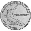 в центре – крупным планом стилизованное изображение осетра, справа – графическое изображение книги, под ней надпись «ACIPENSER GUELDENSTAEDTII BRONDT ET ROTZEBURG», вверху – надпись «КРАСНАЯ КНИГА ПРИДНЕСТРОВЬЯ», внизу – надпись «ОСЁТР РУССКИЙ».