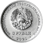 в центре – изображение Государственного герба Приднестровской Молдавской Республики; по кругу – надписи: вверху – «ПРИДНЕСТРОВСКИЙ РЕСПУБЛИКАНСКИЙ БАНК», внизу – год выпуска монеты «2021»; в нижней части под гербом – номинал «3 РУБЛЯ».