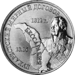 в центре – картографическое изображение территории Бессарабии и надпись на нём «БЕССАРАБИЯ», слева и сверху от них – дата заключения Бухарестского мирного договора «28.05» и «1812 г.», справа – крупным планом портрет М.И. Кутузова, слева полукругом – надпись «БУХАРЕСТСКИЙ МИРНЫЙ ДОГОВОР».