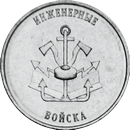 в центре – изображение эмблемы в виде отвала путепрокладчика, якоря, мины, молний и двух скрещённых топоров; по кругу надписи: вверху – «ИНЖЕНЕРНЫЕ», внизу – «ВОЙСКА».