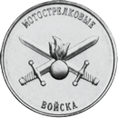 в центре – изображение эмблемы в виде пылающей ручной гранаты на фоне двух скрещённых мечей; по кругу надписи: вверху – «МОТОСТРЕЛКОВЫЕ», внизу – «ВОЙСКА».