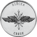 в центре – изображение эмблемы в виде вертикально расположенных молний (трёх – вверх и трёх – вниз) на фоне распростёртых крыльев; по кругу надписи: вверху – «ВОЙСКА», внизу – «СВЯЗИ».