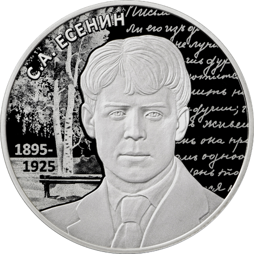 в центре – крупным планом портрет русского поэта и писателя С.А. Есенина, на заднем фоне: справа – фрагмент рукописного текста, слева – изображение берёзы и годы жизни в две строки «1895-1925»; вверху по кругу – надпись «С.А. ЕСЕНИН».