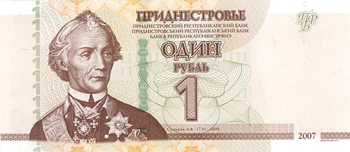 ОПИСАНИЕ ЛИЦЕВОЙ СТОРОНЫ: Вверху - надпись “ПРИДНЕСТРОВЬЕ”, под надписью мелким шрифтом на трёх языках текст "ПРИДНЕСТРОВСКИЙ РЕСПУБЛИКАНСКИЙ БАНК”. В центре - обозначение номинала - “ОДИН РУБЛЬ”, ниже - цифровое обозначение номинала - “1”. Внизу в центре микротекст контурный “ПРИДНЕСТРОВЬЕ”. Слева - портрет А. В. Суворова выполнен в стиле ручной гравюры, слева от неё полосовой элемент в виде повторяющегося номинала (1). Справа - на чистом поле вверху расположен текст “ПРБ”, внизу между орнаментными полосами отпечатан зелёным цветом год образца банкноты - “2007”. Многотоновый водяной знак (портрет А. В. Суворова), под ним высококонтрастный филигранный водяной знак “ПРБ”.