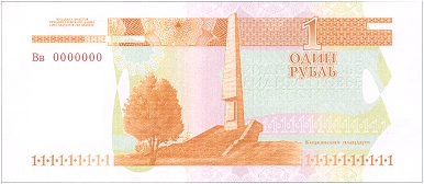 ОПИСАНИЕ ОБОРОТНОЙ СТОРОНЫ: В центре изображение Кицканского плацдарма. Справа вверху расположена надпись “ОДИН РУБЛЬ”, под ней - серия и семизначный номер, выполненные высоким способом печати люминесцирующей краской. Ниже изображение мемориальной доски, расположенное на стеле Кицканского плацдарма. Справа внизу - крупное число “1”. Слева вверху на чистом поле также расположено крупное число “1” и многотоновый водяной знак (портрет А. В. Суворова), под ним высококонтрастный филигранный водяной знак “ПРБ”.