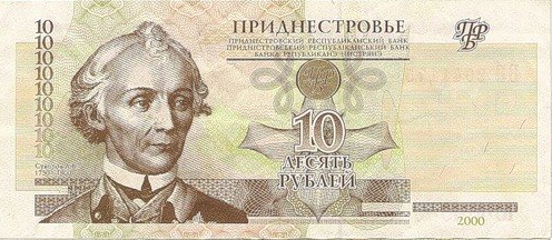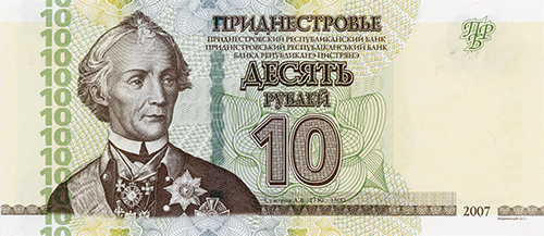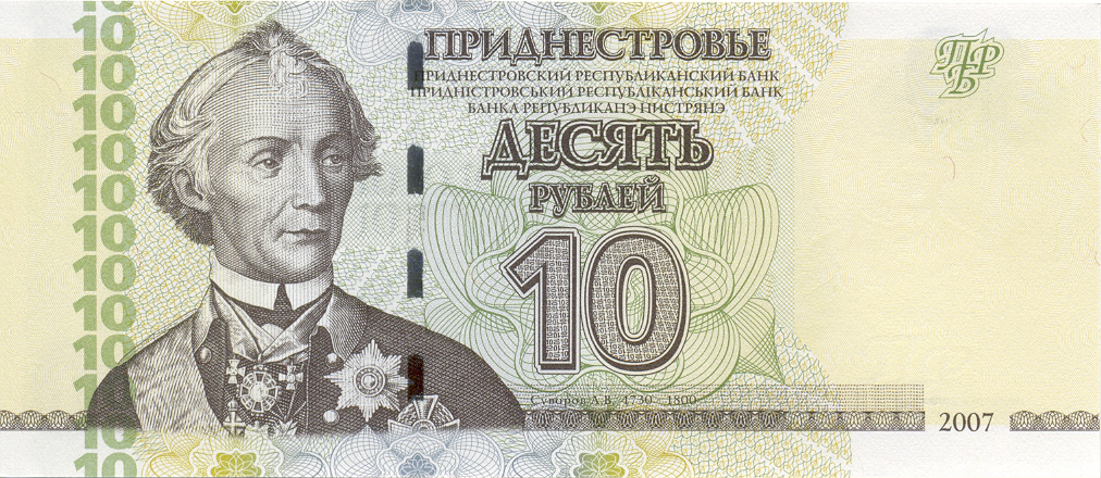 ОПИСАНИЕ ЛИЦЕВОЙ СТОРОНЫ: Вверху - надпись “ПРИДНЕСТРОВЬЕ”, под надписью мелким шрифтом на трёх языках текст “ПРИДНЕСТРОВСКИЙ РЕСПУБЛИКАНСКИЙ БАНК”. В центре - обозначение номинала - “ДЕСЯТЬ РУБЛЕЙ”, ниже - цифровое обозначение номинала - “10”. Внизу в центре микротекст контурный “ПРИДНЕСТРОВЬЕ”. Слева - портрет А. В. Суворова выполнен в стиле ручной гравюры, слева от неё полосовой элемент в виде повторяющегося номинала (10). Справа - на чистом поле вверху расположен текст “ПРБ”, внизу между орнаментными полосами отпечатан коричневым цветом год образца банкноты - “2007”.