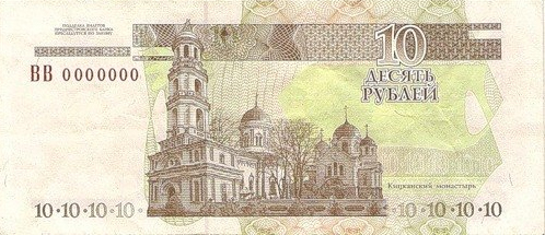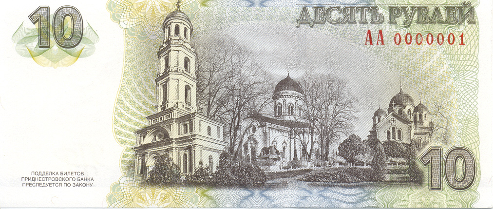 В центре – коллаж с изображением Кицканского монастыря. Слева вверху на чистом поле – крупная цифра «10», внизу – текст «ПОДДЕЛКА БИЛЕТОВ ПРИДНЕСТРОВСКОГО БАНКА ПРЕСЛЕДУЕТСЯ ПО ЗАКОНУ». Справа вверху – надпись «ДЕСЯТЬ РУБЛЕЙ», под ней – серия из двух заглавных букв и семизначный номер, внизу – крупная цифра «10».
