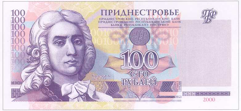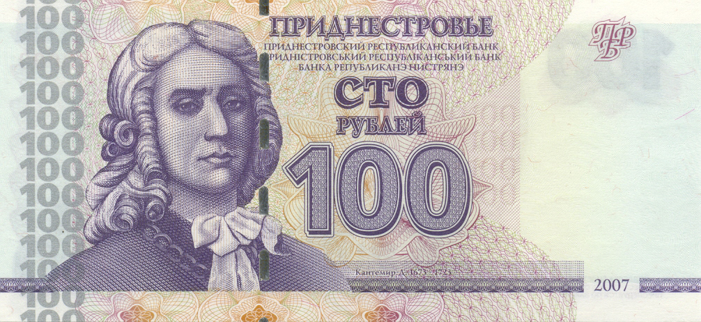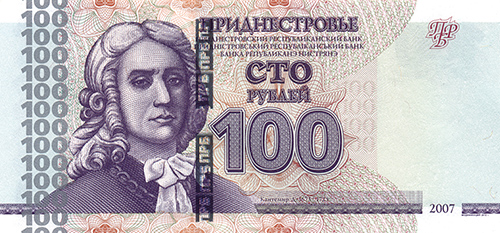 ОПИСАНИЕ ЛИЦЕВОЙ СТОРОНЫ: Вверху - надпись “ПРИДНЕСТРОВЬЕ”, под надписью мелким шрифтом на трёх языках текст ПРИДНЕСТРОВСКИЙ РЕСПУБЛИКАНСКИЙ БАНК”. В центре - обозначение номинала - “СТО РУБЛЕЙ”, ниже - цифровое обозначение номинала - “100”. Внизу в центре микротекст контурный “ПРИДНЕСТРОВЬЕ”. Слева - портрет Дмитрия Кантемира выполнен в стиле ручной гравюры, слева от неё полосовой элемент в виде повторяющегося номинала (100). Справа - на чистом поле вверху расположен текст “ПРБ”, внизу между орнаментными полосами отпечатан фиолетовым цветом год образца банкноты - “2007”.